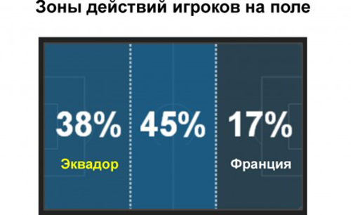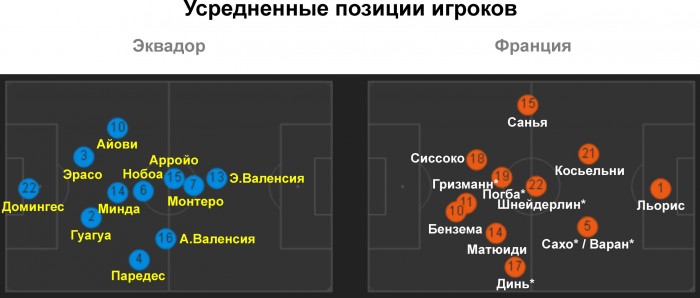 Французская команда превзошла соперника не только в инициативе, но и в результате грамотных позиционных действий игроков. Санья и Сиссоко, при поддержке Погба с одной стороны и Матюиди с Динем с другой, образовывали сдвоенные фланги, оказывавшие постоянное давление на оборону соперника. Противодействия со стороны Эквадора в их зонах оказано не было – Айови, Передес и Антонио Валенсия на троих совершили всего 1 отбор.