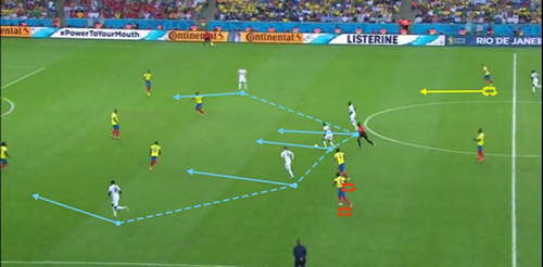 Атака Франции на завершающей стадии. Вновь игроки нападения удачно располагаются между линиями обороны соперника (желтые). Игроков Франции опекают, но зонально, и каждый из них открыт для приема мяча. Погба (красный) выполняет проникающую передачу, мяч беспрепятственно принимает Бензема. На фланге открывается Санья (белый).