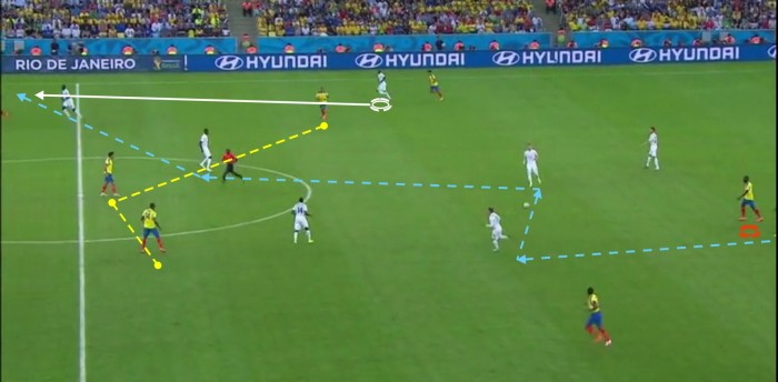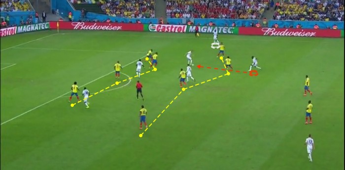 Удачное расположение игроков Франции между линиями соперника после перехвата в центре поля. Они имеют возможность для быстрой атаки 5х5. Нобоа и А.Валенсия (красные) находятся сзади, Монтеро (желтый) успевает возвратиться, а Арройо и вовсе выключился из борьбы. Лишь Минда успевает поддержать защиту, но и он пока не вступил в отбор.