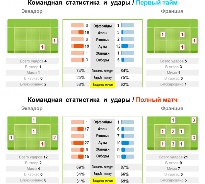 Анализ основных статистических показателей команд по итогам встречи не следует принимать буквально, так как Эквадор практически тайм отыграл в условиях численного преимущества соперника. Однако на данный факт мы можем взглянуть с другой стороны – рассмотрев те же показатели, но по состоянию после первых 45 минут игры. И здесь мы можем наблюдать, что основные из них аналогичны. То есть главной причиной лидирующей роли Франции на протяжении всего матча стало не ее численное преимущество, а пассивность Эквадора в обороне центра поля и его слабая вариативность в атаке.