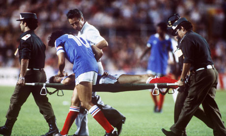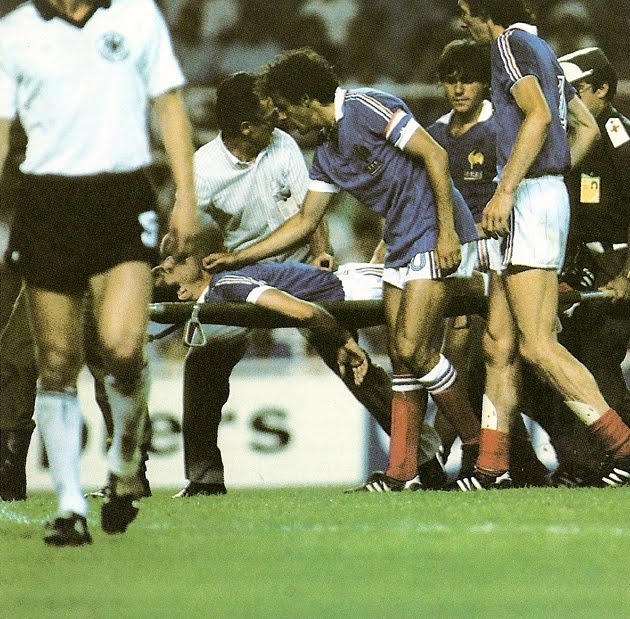 За всю историю чемпионатов мира есть матчи, которые стали легендами. Это и матчи, в которых определялся чемпион мира, такие как, к примеру, Бразилия – Уругвай 1950 года или Англия – ФРГ 1966 года. Но в этом славном ряду матчей-легенд стоит и полуфинал 1982 года Франция – ФРГ, который, приходилось читать такое мнение, является одним из лучших, если не самым лучшим матчем, сыгранным на чемпионатах мира. Конечно, это дело вкуса, но тот, кто этот матч видел в прямом эфире, а если еще и симпатизировал одной из команд, в течение двух часов пережил незабываемые впечатления. Вся та драматургия, которая возможна в футболе, была на поле стадиона «Рамон Санчес Писхуан», что в Севилье. Кто не помнит, как Шумахер вырубил Баттистона, как в овертайме Франция быстро повела 3:1, как Клаус Фишер ударом в падении через себя сравнял счет, как французы сначала лучше били пенальти, но затем в предчувствии успеха дрогнули и дважды не забили?