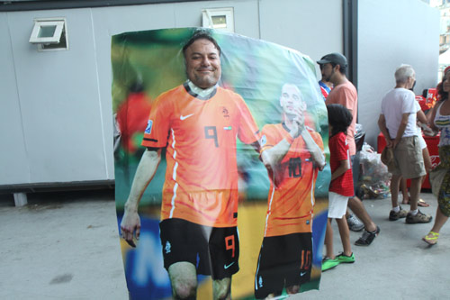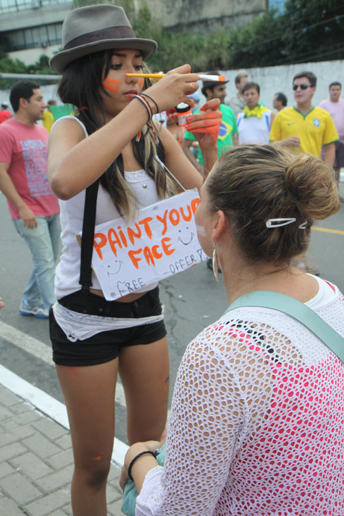 Біля самої арени – вирує уже інша культура – фанатська. «Pаint your face» - табличка на шиї у дівчини, котра запрошує розмалювати обличчя фанатів у кольорах збірної Нідерландів всього за 5 реалів. Охочих доволі багато. «Розмальовка» приносить обопільну радість – і «художнику», і «моделі».