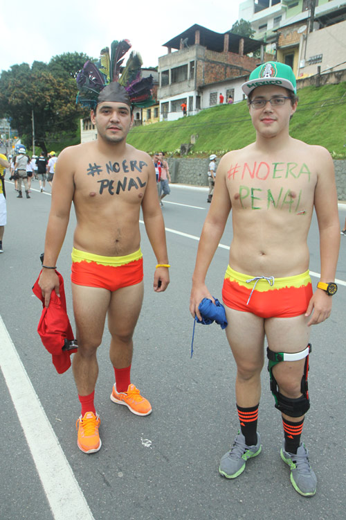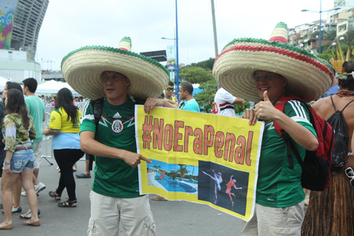 Мексиканці все ніяк не заспокояться, що пенальті у їхні ворота у матчі з голландцями був несправедливий, тому «притягли» на чвертьфінал плакат із написом «Пенальті не було!». Однак показують його з усмішкою, а отже це більше фанатський прояв, ніж протест.