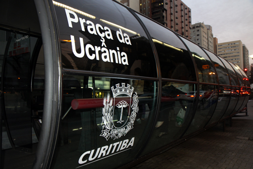 Яскрава ознака того, що українці у Бразилії є, і тут їх дуже багато – просто перед очима! Ну де ще ви знайдете площу України?! А у столиці штату Парана – місті Куритиба – така площа є! Напис на скляному тубі – це автобусна зупинка. До речі, вигадав такий формат зупинки архітектор Жайме Лернер.