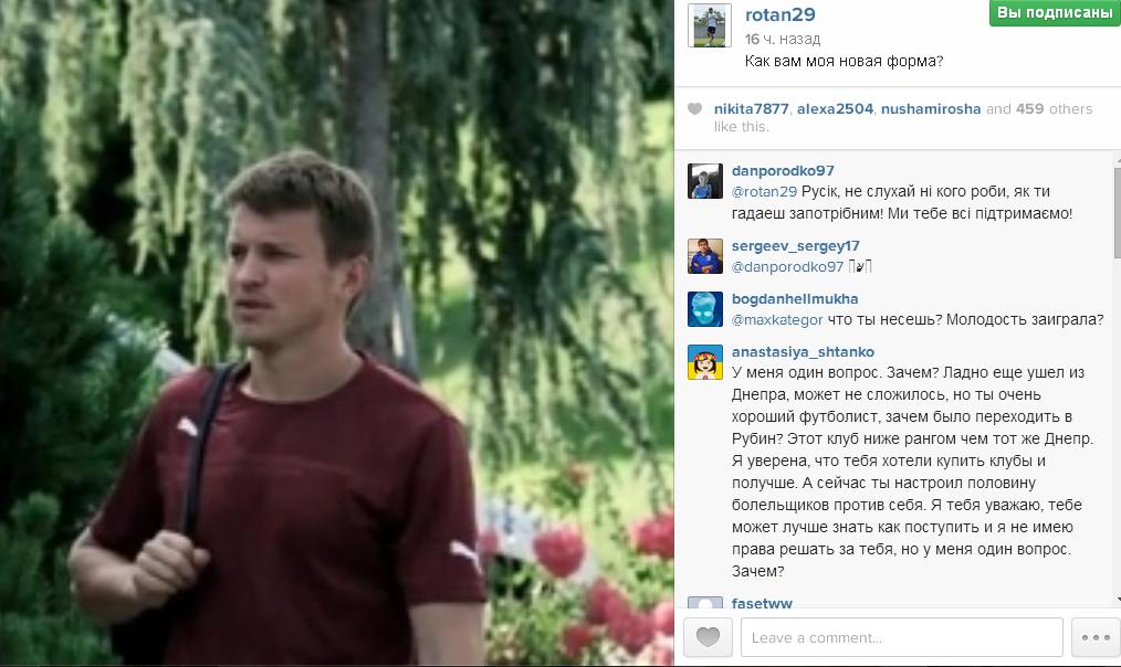 Капитан сборной Украины Руслан Ротань на своей странице в Instagram выложил фото в футболке «Рубина» и спросил подписчиков: «Как вам моя новая форма?» Ответов футболист получил предостаточно, большинство от болельщиков «Днепра», которые недоумевают по поводу того, как капитан ушел из клуба. Слов много, много нелицеприятных высказываний. Ротань в комментариях также попытался прояснить ситуацию: