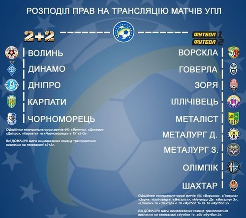 Телеканал 2+2 транслюватиме домашні матчі «Динамо», «Дніпра», «Волині», «Карпат» «Чорноморця» і, можливо, харківського «Металіста». Інші клуби залишаться з ТК «Футбол». Про це розповів журналіст та ведучий програми «ПроФутбол» на ТК 2+2 Ігор Циганик.
