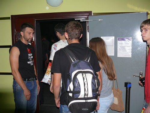 И вот первый болельщик пересекает линию пропуска и прорывается в зал. За ним следуют его "коллеги", получая при входе фанбэты для голосования.