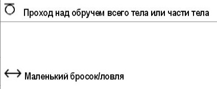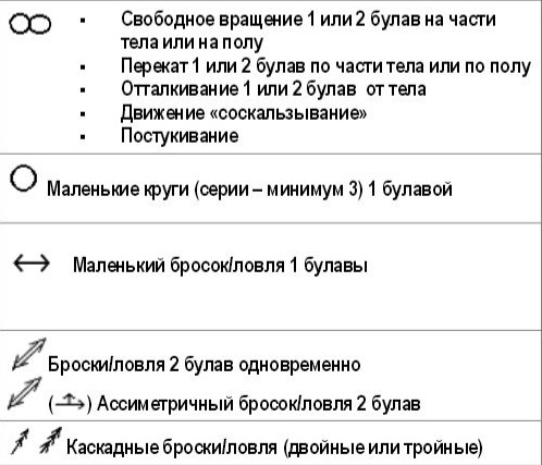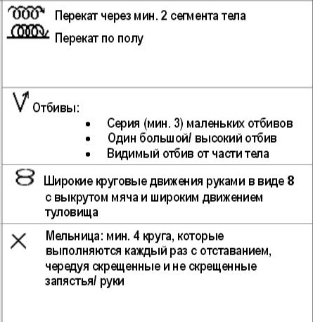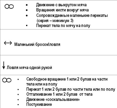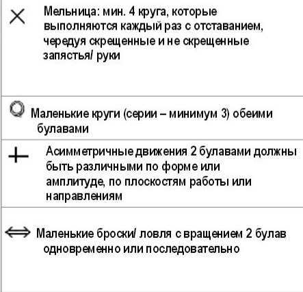 - Исключение: мяч и булава(ы) за спиной (нестабильный баланс) во время движения с вращением тела или Трудности Вращения.