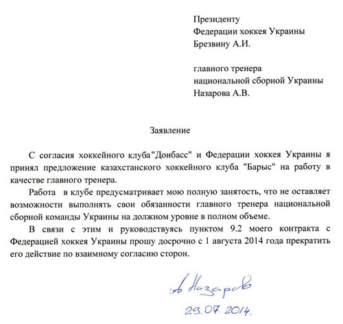 На адресу Федерації хокею України надійшла заява від головного тренера національної збірної команди України Андрія Назарова. У документі Андрій Вікторович просить достроково припинити дію його контракту.