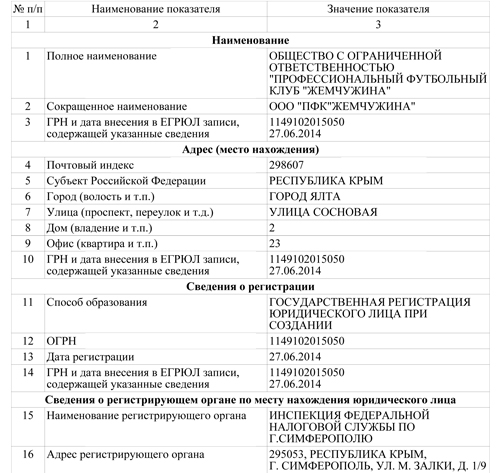 Сайт Sport.ua, на котором находятся сведения о регистрации юридических лиц РФ, по запросу «ОБЩЕСТВО С ОГРАНИЧЕННОЙ ОТВЕТСТВЕННОСТЬЮ "ПРОФЕССИОНАЛЬНЫЙ ФУТБОЛЬНЫЙ КЛУБ "ЖЕМЧУЖИНА"» выдает следующую информацию: