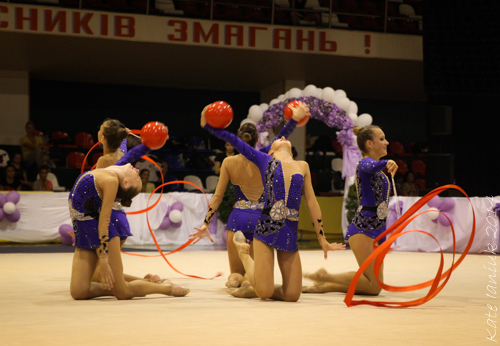 Групповые упражнения - традиционно не самый сильный вид для украинских гимнасток - был единственным, в котором проводились финалы в отдельных видах на этом чемпионате. Пожалуй, реальную конкуренцию национальной команде не смог составить никто, даже её второй состав, а лидеры данного вида (Днепропетровск и Крым; на фото ниже), продемонстрировав стабильность, удостоились уже привычных для них наград.