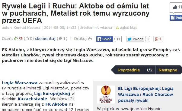 «Насколько «Легия» будет фаворитом в играх против казахов, настолько «Рух» Хожув – аутсайдер в противостоянии с «Металлистом». Коллектив из Восточной Украины в 2013 году прервал, продолжающуюся 17 лет, гегемонию «Шахтера» и «Динамо», заняв второе место в турнирной таблицы Премьер-лиги...»