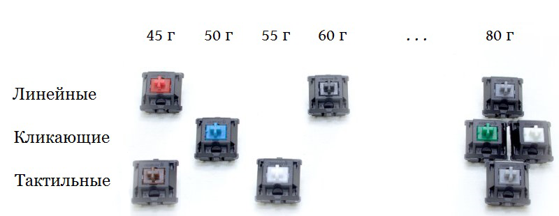 На фото показана вся линейка переключателей серии MX. Всего их девять цветов. Самый левый на фотографии переключатель в сером корпусе — с фиксацией. Предполагается использовать в «клавиатурах для блондинок» для удобного зажимания Caps Lock. Остальные переключатели: MX Red, MX Black, MX Grey — линейные. MX Blue, MX Green, MX White — с тактильной отдачей и звуковым сопровождением. MX Brown, MX Milk, MX Grey — с тактильной отдачей. Также они различаются по силе нажатия до срабатывания механизма. В импровизированной таблице ниже все свойства переключателей показаны более наглядно.
