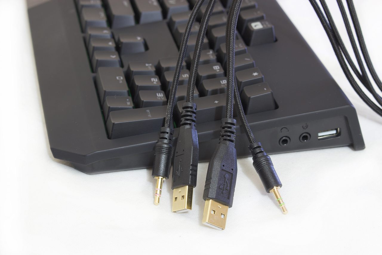 В целом клавиатура довольно удобна и продуманна. Длинный двухметровый кабель поможет удобней расположить клавиатуру. А разъёмы на правом торце упрощают подключение практически любой игровой гарнитуры. Клавиатура выглядит монолитной, её вес и большое количество резиновых ножек позволяют ей с достоинством держаться на любом столе.