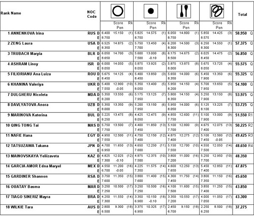 В финал прошли первые восемь гимнасток. Завтра соревнования начнутся с нуля, т.е. результаты квалификации не учитываются при распределении наград.