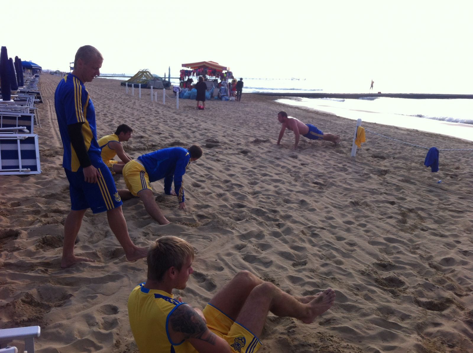 Фото: На зарядке - Роман Пачев, Игорь Борсук, Олег Зборовский и Олег Будзько. На дальнем плане отжимается Виктор Пантелейчук.