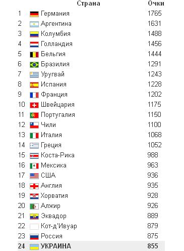 Лучшей командой мира остается Германия. Следом за немцами расположились еще одни финалисты мундиаля аргентинцы. А вот команда Нидерландов провалившая начало отбора на чемпионат Европы, сегодня 4-я, ее место в тройке лидеров заняла команда Колумбии.