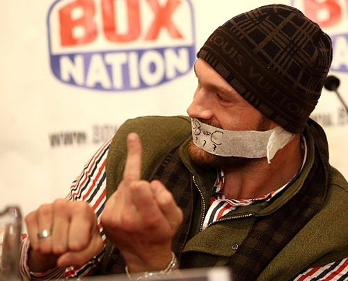 Чтобы не наговорить ничего лишнего, британский супертяжеловес Тайсон Фьюри пришел на пресс-конференцию с Дереком Чисорой с заклеенным ртом. Впрочем, все свои слова он сказал с помощью красноречивых жестов.