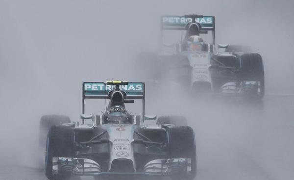 Вже на другому колі після рестарту гонки між дуетом Росберг – Хемілтон та рештою пелотону була справжнісінька прірва – на мокрій трасі Mercedes вигравав непристойно багато, тож коли більшість команд поїхали в бокси за іншим типом шин Ніко з Льюісом залишилися на трасі, не відчуваючи на собі жодного тиску з боку опонентів. У підсумку Росберг побував у баксах на 14-му колі, а Хемілтон – на 15-му.