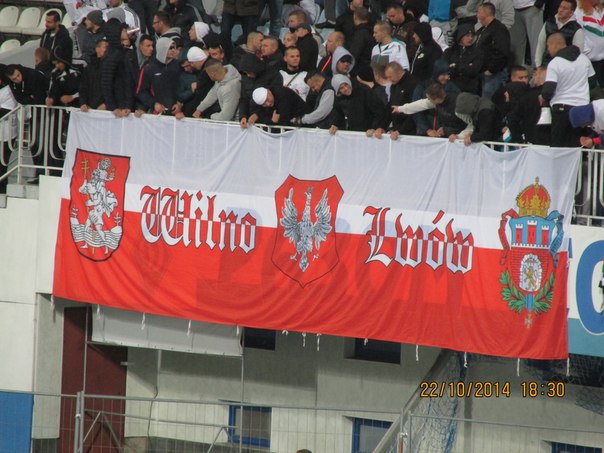 Как доказательство предоставлены фото флага батальона «Азов», который вывесили болельщики «Металлиста», а также баннер, который вывесили фанаты «Легии» о том, что Львов принадлежит Польше.