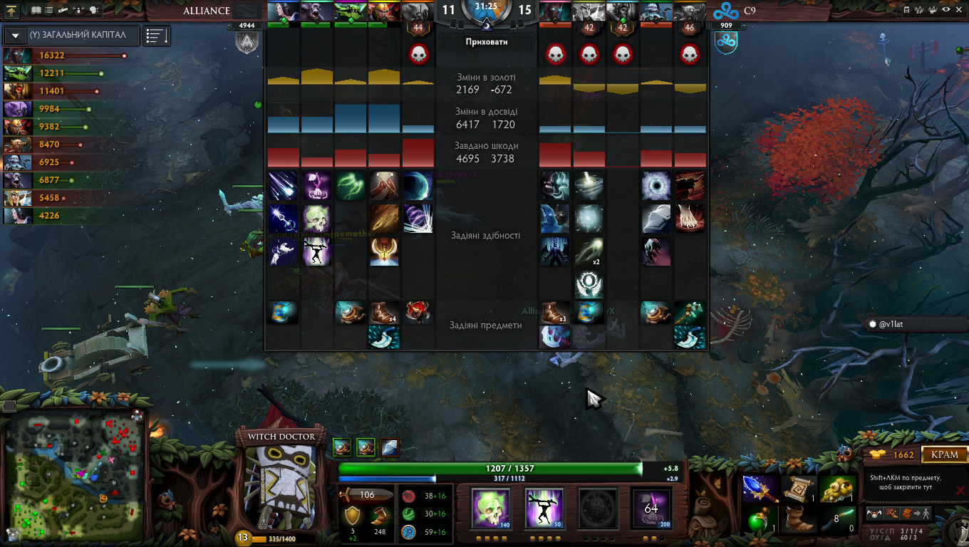 13:29 Прошло полчаса игры. Cloud9 имели преимущество в 10 тысяч ипо золоту и опыту, но очень удачный ульт от Witch Doctor перевернул игру.