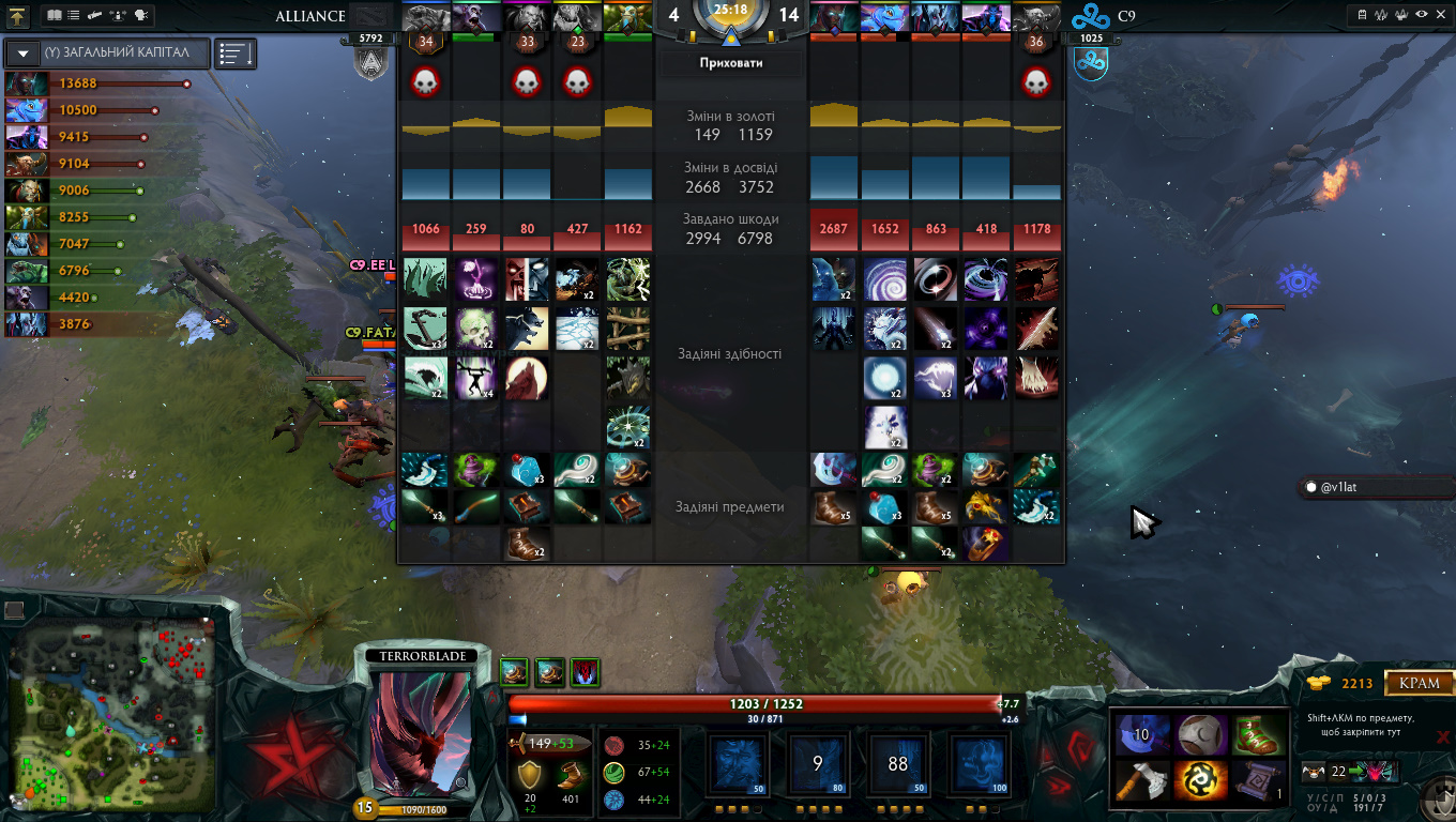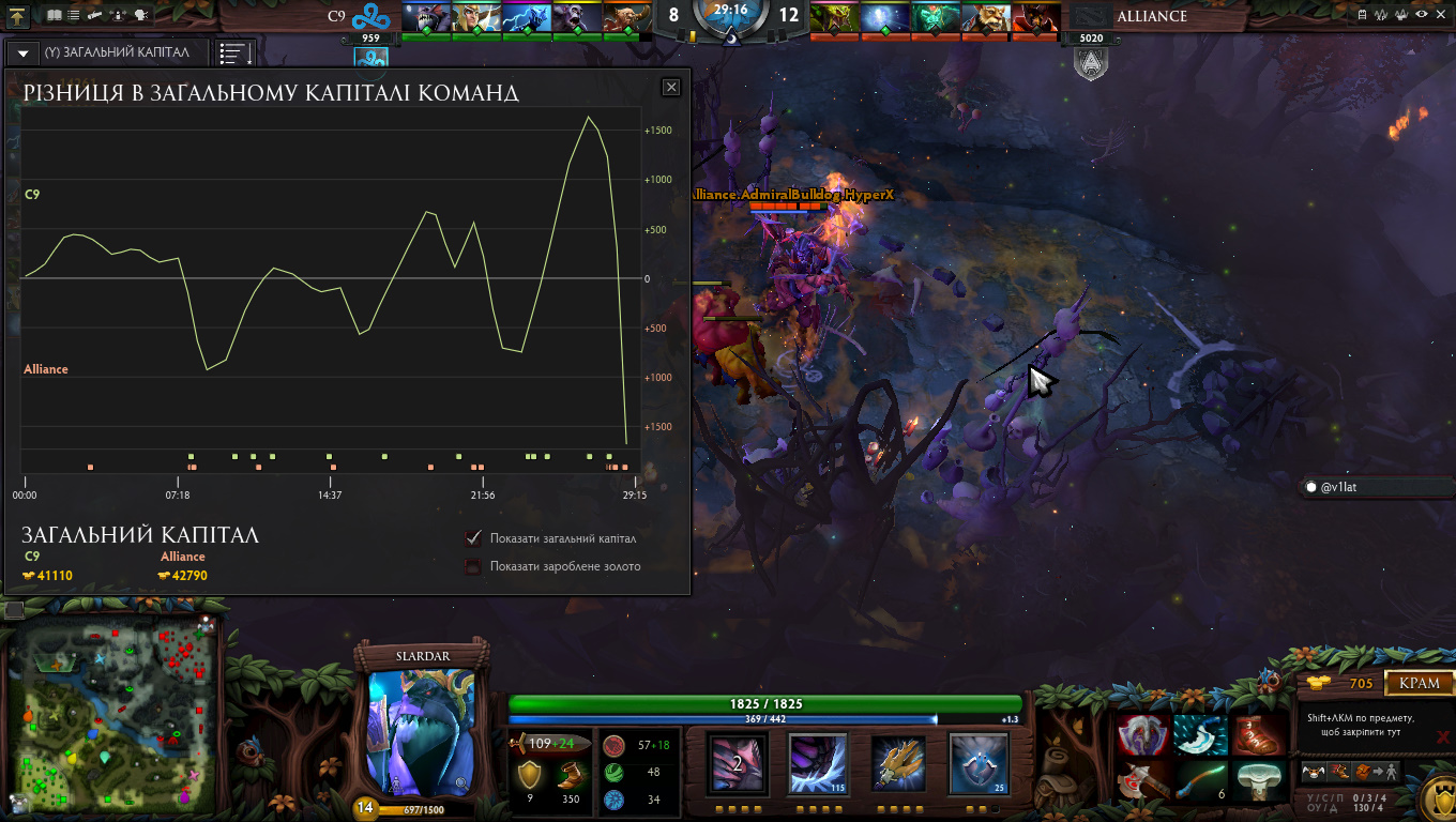 14:22 Cloud9 забирают первого Рошана. Alliance зажимаются на своей части карты.