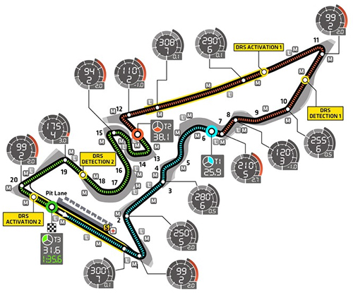Ще однією особливістю траси є те, що вона закручена проти годинникової стрілки, а таких в цьогорічному календарі три – США, Бразилія й Абу-Дабі, й усі вони завершують сезон, тож фізична підготовка пілотів, насамперед навантаження на шийні м’язи, потребують особливої уваги.