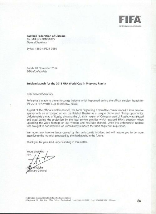 Федерация футбола Украины получила письмо от ФИФА, в котором международная футбольная ассоциация принесла свои извинения по поводу инцидента, который произошел во время презентации эмблемы Кубка Мира ФИФА-2018 в Москве. Ниже приводим его содержание: