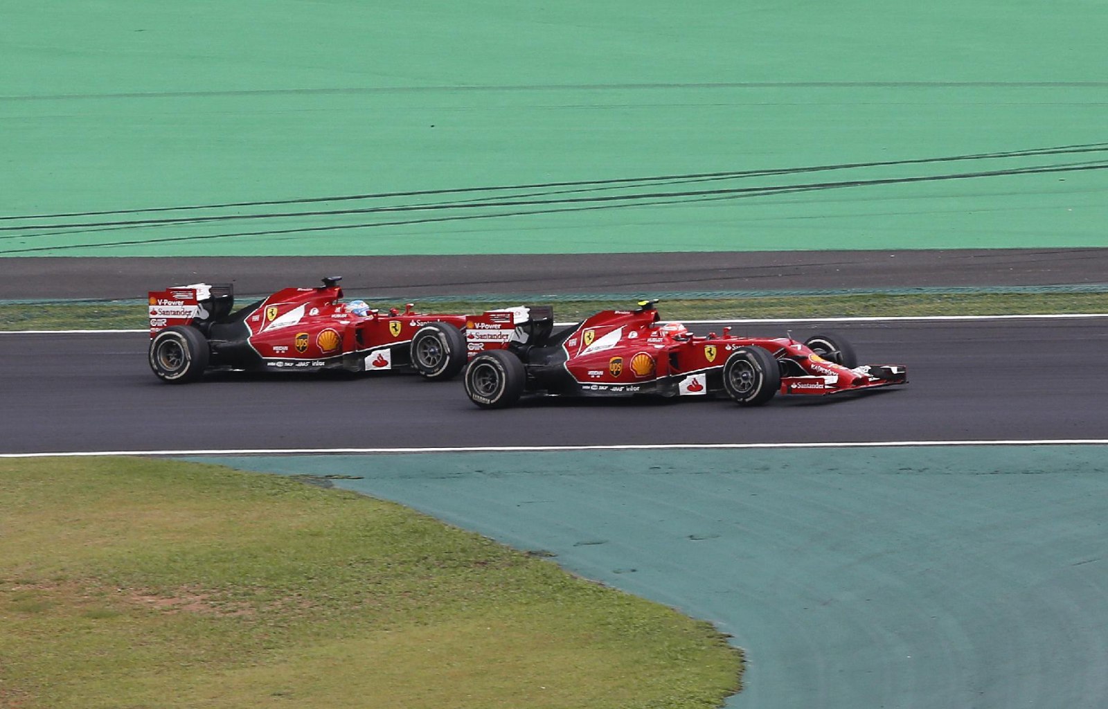 В стані Ferrari сьогодні проявили фантазію, розділивши гоночну тактику для Алонсо та Ряйкконена. Фернандо, як і решта пілотів їхав з тактикою трьох піт-стопів, в той час як у Кімі стояло непросте завдання – проїхати практично половину гоночної дистанції на одному комплекті Medium. В якийсь момент, коли фіна обганяли Баттон з Феттелем здавалося, що Кімі не зможе дотягнути до фінішу й доведеться як усім їхати в бокси втретє. Та найцікавіше почалося за сім кіл до фінішу, коли Ferrari №7 наздогнала така сама червоногаряча машина з №14 на борту. Гума у Фернандо знаходилася в значно кращому стані, проте Ряйкконен просто так напарника пропускати не збирався. Їх дуель затягнулася на кілька витків трасою, та все ж Алонсо зумів взяти гору, вийшовши на 6-те місце.