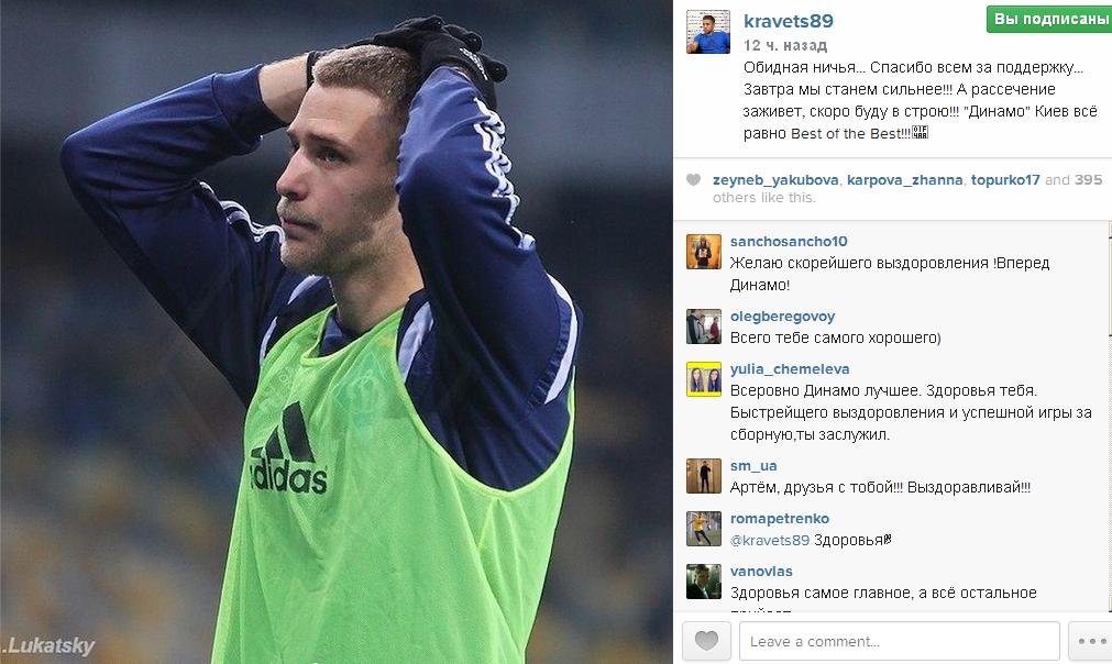 «Обидная ничья... Спасибо всем за поддержку... Завтра мы станем сильнее!!! А рассечение заживет, скоро буду в строю!!! «Динамо» Киев всё равно Best of the Best!!!» - написал Кравец.