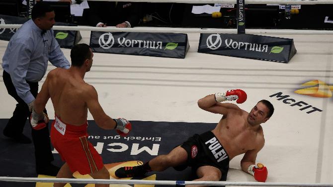 Бой начался с атак Пулева, которому уже в начале поединка удалось пробить джебом. Кличко также завелся с первых секунд, пошел вперед и левым боковым ударом в челюсть отправил болгарина в нокдаун. Вскоре рефери еще раз открыл счет Пулеву.