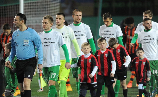 «Карпаты» - «Шахтер» львовский клуб надел футболки с надписью «Слава українскій армії», а «горняки» отказались от подобного жеста.