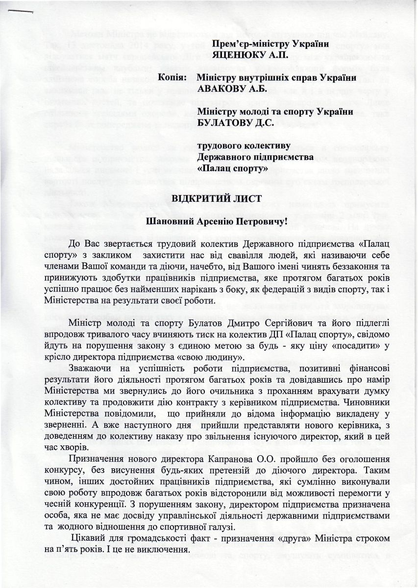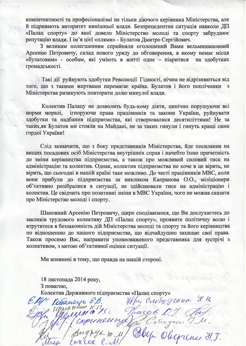 Шановний Арсенію Петровичу, щиро сподіваємося, що Ви дослухаєтесь до закликів трудового колективу ДП «Палац спорту», проявите політичну волю і втрутитеся в беззаконність дій Міністерства молоді та спорту та його керівництва по відношенню до нашого підприємства, що відчайдушно захищає свої права. Також просимо Вас, направити уповноваженого представника для зустрічі з колективом, з метою об’єктивної оцінки ситуації.