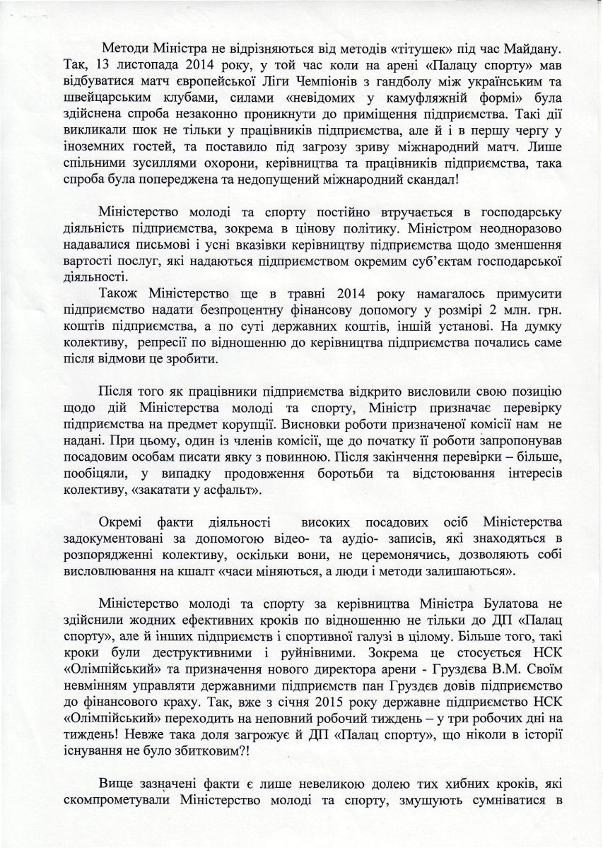 Міністр молоді та спорту Булатов Дмитро Сергійович та його підлеглі впродовж тривалого часу вчиняють тиск на колектив ДП «Палац спорту», свідомо йдуть на порушення закону з єдиною метою за будь - яку ціну «посадити» у крісло директора підприємства «свою людину».