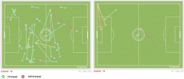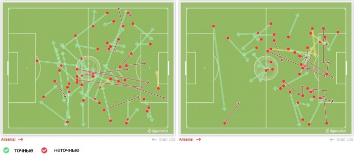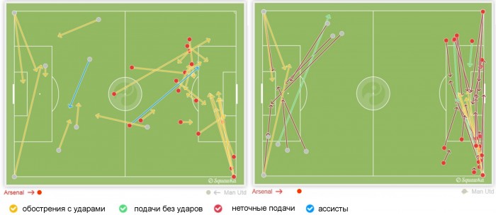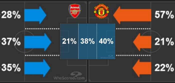 Диаграмма флангов атак и зон действий. Смещение акцентов МЮ в нападении на правый фланг соответствует позициям игроков. Доли зон действий отображают территориальное преимущество «канониров» в этом матче.