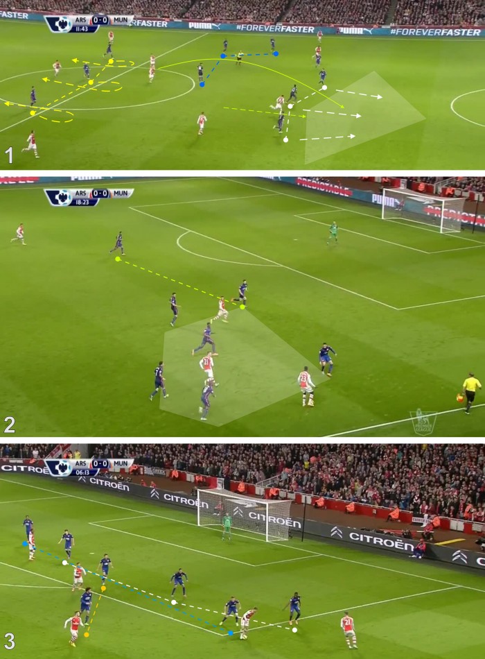 – Мяч в атаку доставляется длинными передачами в адрес нападающих (83 против 40 у «Арсенала» согласно данным WhoScored.com, в том числе 18 – на совместном счету Бэкетта и Мак Нейра). Из обороны допускаются длинные безадресные выносы в центр поля. Центральные полузащитники + один из фланговых латералей содействуют сохранению мяча у нападающих в возникающих подборах или через пас. Феллаини часто выступает адресатом длинной верховой передачи. Игроки края поля обязательно поддерживают позиционную атаку – до 50% атак «Манчестер Юнайтед» проводится через фланговые зоны.