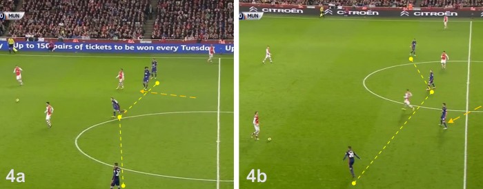 Пара игроков центральной зоны Феллаини – Кэррик получила в этом матче сложные задания. Первым было содействие в локальном прессинге при традиционном розыгрыше «Арсенала» через мелкий и средний пас во фланговых зонах центра поля (Кадр 2 внизу). Здесь как минимум один из них должен был усиливать группу прессингующих защитников в особо тесном взаимодействии с игроком бровки. Во–вторых на развитых стадиях атак «канониров», когда они выходили крупными силами к пределам штрафной подопечных Ван Гала, оба центральных полузащитника обязаны были предельно смыкать линию с оборонцами. Это одновременно обеспечивало полное численное преимущество при защите штрафной и ширину оборонительной линии, которая нейтрализовала бы опасную смену направления атаки на завершении. Кадр 3 наглядно демонстрирует достоинства такого построения обороны. Наконец, на самой ранней стадии обороны Феллаини – Кэррик посменно выдвигались на первый ее рубеж, состоящий из тройки нападающих (Кадры 4а–4b).