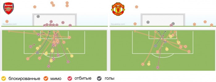 Число ударов (23), которые игроки «Арсенала» сумели нанести по воротам «Юнайтед», великовато. Его также следует записать в минус оборонительной тактике Ван Гала. Центральная направленность атак «канониров» обусловила заметную часть ударов, нанесенных из района штрафного сектора. Другой причиной частого исполнения ударов из этой зоны стали сами удачные действия МЮ в обороне – соперник просто вынужден был чаще бить издали. Не считая заблокированных, 10 ударов (почти половина) были нанесены из пределов штрафной. Низкая точность «канониров» на завершении не позволила реализовать данное достижение, которое, вероятно, останется для «Арсенала» важнейшим в этом матче.