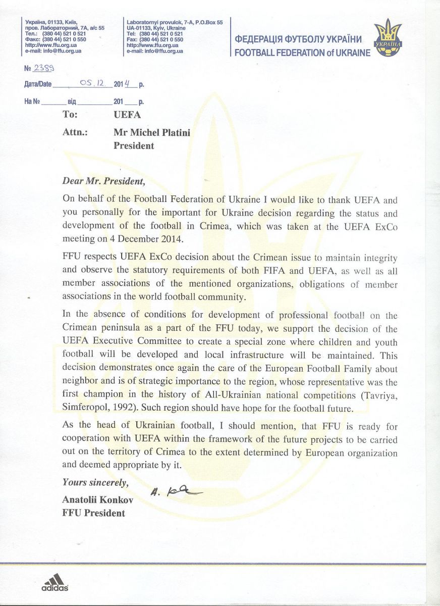 Президент ФФУ Анатолій Коньков з офіційним листом звернувся до президента УЄФА Мішеля Платіні. Із перекладом тексту звернення можна ознайомитися тут.