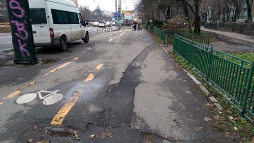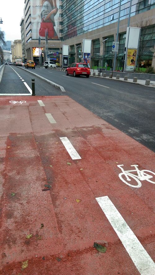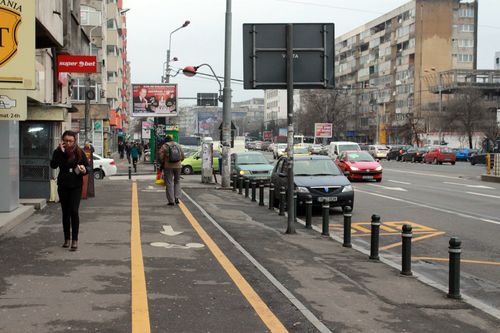 Велодорожки в Бухаресте есть. В старых центральных кварталах отделены от дороги бордюрным камнем и ограждениями. В спальных районах просто выделены цветом на тротуаре.