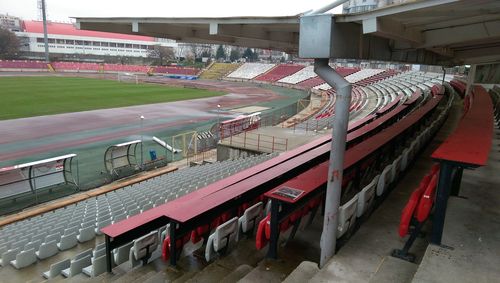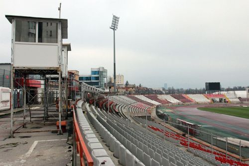 Такое впечатление, что время здесь остановилось, видимо, мало что изменилось с 50-х годов, когда его построили. Потертые сиденья на трибунах, лужи на беговых дорожках отражают серые облака, осветительные мачты уныло нависают над вытоптанным полем. Над трибунами возвышаются вышки то ли для комментаторов, то ли для представителей полиции.