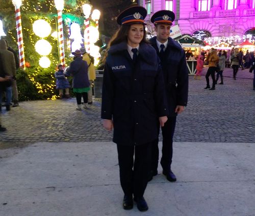 Полицейские, позирующие фотографу на площади с рождественской ярмаркой