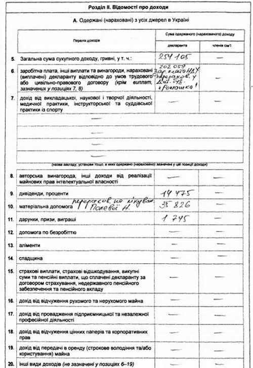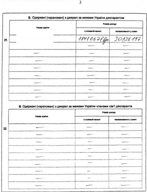 Згідно з документом, 254 тисячі 105 гривень мер заробив в Україні та 20 мільйонів 328 тисяч 197 гривень – за кордоном.