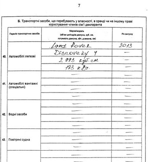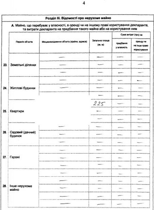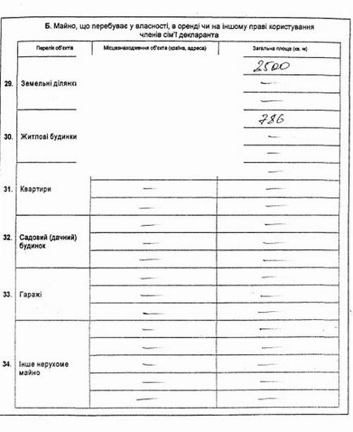 Згідно з декларацією, Кличко володіє квартирою у 225 кв. м, а його сім'я – будинком на 786 кв. м, земділянкою 2500 кв.м та автомобілем Land Rover 2013 року випуску.