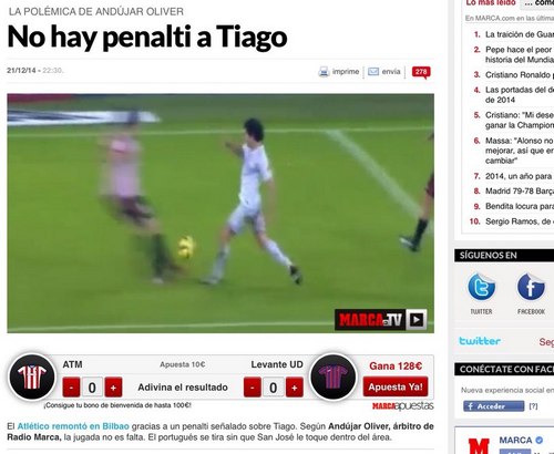 Не прошло и десяти минут, как у «матрасников» появился шанс выйти вперед. Эрнандес Эрнандес назначил пенальти на вороты Ираисоса за фол Сан Хосе на Тьяго в пределах штрафной «Атлетика». С чем не поспоришь, - да, Тьяго упал в штрафной басков. Ну и все. Некоторые эпизоды пора перестать скромненько называть «спорными». Испанская Marca написала простой и лаконичный заголовок: «No hay penalti a Tiago» («Пенальти на Тьяго не было»).