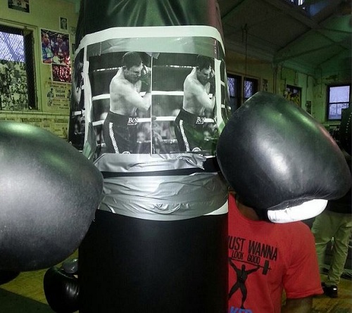 Дженнингс отрабатывает удары на мешке с изображением Кличко
