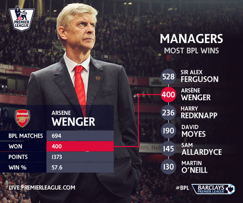 Для Арсена Венгера победа над «Куинз Парк Рейнджерс» стала знаковой – 400-й в рамках АПЛ. По этому показателю коуч «Арсенала» уступает лишь сэру Алексу Фергюсону, который за свою длительную тренерскую карьеру одержал у руля МЮ 528 побед. Кроме этого Венгер добыл в лондонском дерби 600-ю победу во всех турнирах на должности главного тренера «канониров».