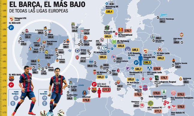 Каталонская «Барселона» с ростом 177,3 замыкает рейтинг. Самым высоким клубом Европы назвали венгерский «Диошдьёр» с ростом 186,3.