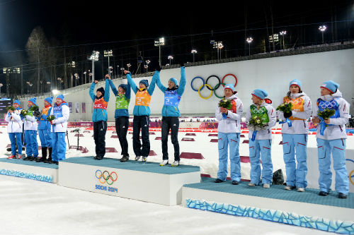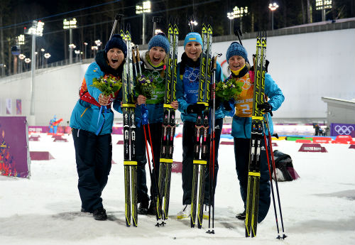 Женская сборная Украины по биатлону в составе Виты и Вали Семеренко, Юлии Джимы и Елены Пидгрушной выиграла ЗОЛОТО на Олимпиаде-2014 в Сочи! Время украинской команды – 1:10:02.5.