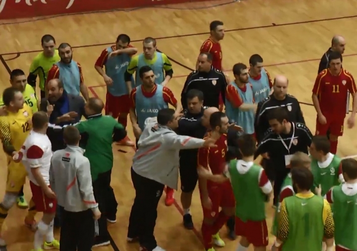 Игра таки была продолжена, но поляки играли «4 на 3», и за несколько секунд до истечения большинства Будняк нашел возможность для точного удара. Македония тут же перешла на игру с пятым полевым, и Леовски сравнят счет. Однако через минуту гости в шестой раз нарушили правила, причем, фол был из разряда не то что 100-процентных, а 200-процентных. Его фиксация привела к новой вспышке хамского поведения официальных лиц сборной Македонии, в том числе и того самого, который «отжигал» во время потасовки. И вновь судьи были облиты водой из бутылки, и вновь в их адрес были плевки. Ситуация вновь была близка к тому, чтобы матч был сорван, и руководителю Комитета польского футзала Казимежу Греню стоило больших усилий, спустившись к скамейке запасных, вернуть ситуацию в какое-то приемлемое русло. После еще одной большой паузы в матче Артур Поплавский реализовал 10-тиметровый, все оставшееся время Македония играла с пятым, но сборная Польши довела игру до непростой победы. Главный тренер сборной Польши, итальянец Андре Буччиоль после игры назвал все произошедшее «позором» – лучше и не скажешь.